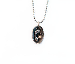Handcrafted from a vintage wax seal, this talisman features a footprint and dog paw symbolizing the love we share with our canine companions. This fine silver talisman is approximately a 1/2" x 3/4" oval and hangs on a 18" stainless steel baby...