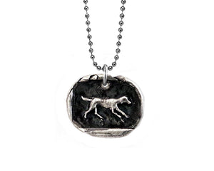 Handcrafted from an antique wax seal from late 1800 France, this talisman features a greyhound dog. The heraldic symbol of a greyhound denotes a person of courage, vigilance, and loyalty. This fine silver talisman is approximately 5/8” round and hangs...